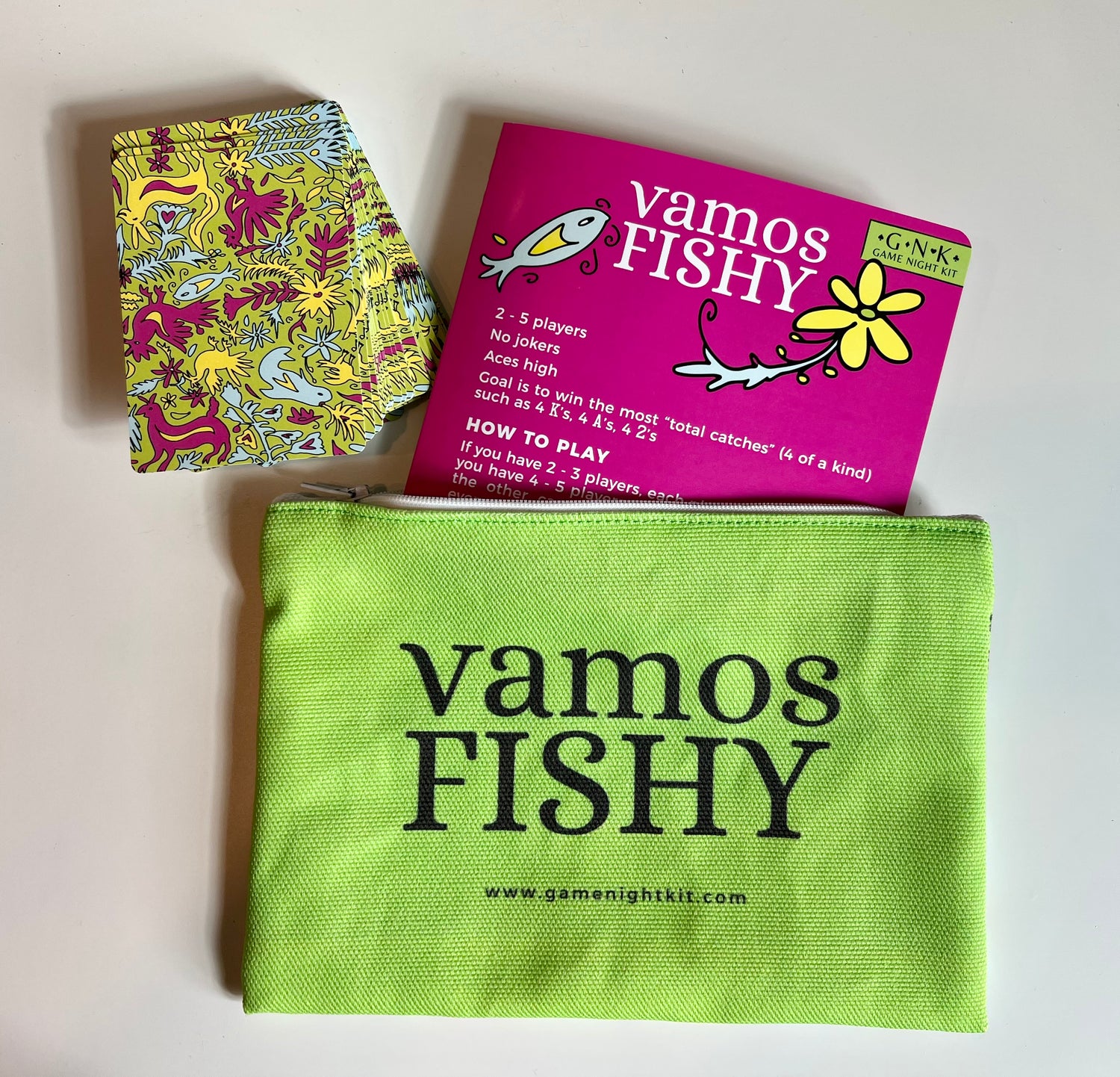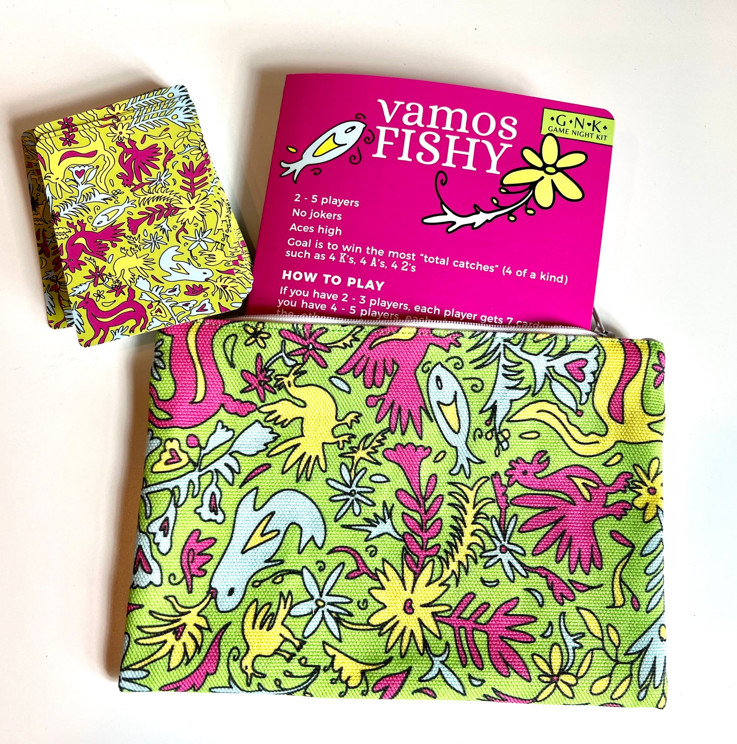 Vamos Fishy is the perfect game for the littles. The Otomi art puts a spin on the classic Go Fish. The GNK includes 1 deck of cards and easy instructions with a sprinkle of Spanish lessons - all contained in the cutest zippered canvas pouch. Otomi art by Michele Bell Studio.